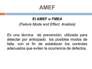 Este documento describe el Análisis de Modos y Efectos de Falla (AMEF), una técnica para prevenir defectos mediante la detección anticipada de posibles modos de falla. El AMEF identifica modos de falla potenciales, evalúa su severidad, ocurrencia y capacidad de detección, y clasifica los riesgos para enfocarse en la prevención de problemas. Se aplica tanto a diseños como procesos de manufactura. El documento explica el procedimiento para realizar un AMEF, incluyendo la determinación del área a anal