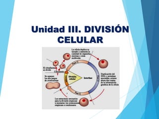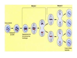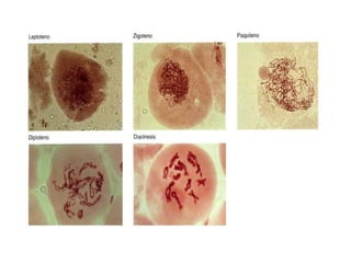 El documento describe las fases del ciclo celular eucariótico, incluyendo la interfase y la división celular. Explica que la interfase consta de las fases G1, S y G2, mientras que la división celular incluye la mitosis y la meiosis. Luego procede a describir en detalle cada una de las fases de la mitosis y la meiosis, incluyendo sus etapas, los procesos involucrados y los resultados de cada división. Finalmente, sugiere temas para investigar relacionados con anomalías cromosómic