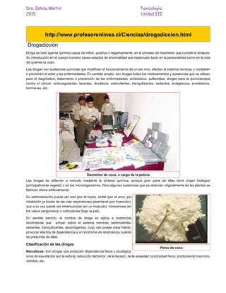 El documento describe diferentes tipos de drogas, incluyendo sus efectos y clasificaciones. Discute narcóticos como heroína y morfina, estimulantes como anfetaminas y cafeína, sedantes como barbitúricos, y drogas consideradas legales como alcohol, tabaco y ciertos medicamentos. También describe los diferentes tipos de consumidores de drogas, desde consumidores experimentales hasta adictos, y los riesgos asociados con el abuso de drogas como daños a la salud, dependencia y síndrome de abstinencia.