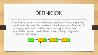 Este documento describe las estructuras de datos de listas enlazadas. Explica que las listas enlazadas permiten inserciones y eliminaciones eficientes en cualquier punto de la lista y describen diferentes tipos como listas enlazadas simples, doblemente enlazadas y circulares. También cubre conceptos como nodos, enlaces y punteros, así como operaciones comunes como agregar, insertar, eliminar y buscar elementos en una lista.