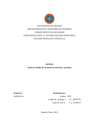 El documento presenta la Guía GEMMA (GEMMA), una herramienta gráfica que define los diferentes estados por los que puede pasar un sistema de producción automatizado, incluyendo funcionamiento normal, paradas, defectos y más. Explica que la GEMMA se complementa con GRAFCET para modelar procesos de producción de manera progresiva. Resume los principales grupos de estados definidos por la GEMMA y cómo esta herramienta puede utilizarse en las distintas etapas de desarrollo de un automatismo.