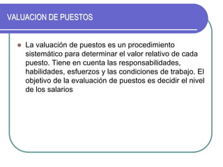 El documento describe diferentes métodos para la valuación de puestos, incluyendo el método de escalonamiento y el método de grados predeterminados. El objetivo de la valuación de puestos es determinar el valor relativo de cada puesto para establecer una estructura salarial equitativa. Los métodos evalúan factores como responsabilidades, habilidades y condiciones de trabajo para clasificar los puestos.