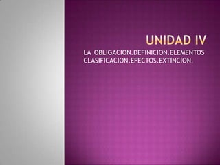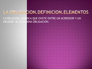 La obligación se define como la relación jurídica que existe entre un acreedor y un deudor, tiene elementos como un contenido económico y puede clasificarse en diferentes tipos. La obligación se extingue cuando se cumplen los efectos entre las partes.