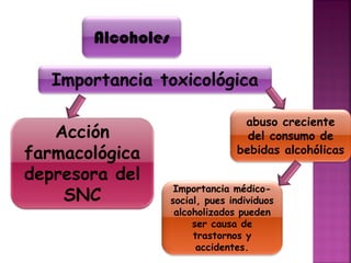 Este documento trata sobre la importancia toxicológica de los alcoholes etílico y metílico. Describe las vías de penetración de los alcoholes en el cuerpo, los fluidos biológicos en los que se pueden encontrar y los métodos para su recolección y conservación. También explica diversos métodos analíticos para la identificación y cuantificación de alcoholes como la cromatografía de gases y métodos enzimáticos. Resalta los riesgos de intoxicación por metanol debido a su uso fraudulento en bebid