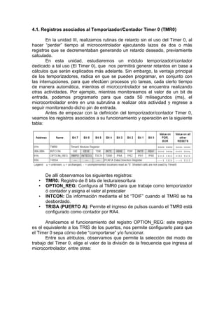 Este documento describe el temporizador TMR0 y las interrupciones en el microcontrolador PIC16F84. Explica los registros asociados con el TMR0, cómo funciona como temporizador o contador, y cómo se pueden realizar cálculos y programas con él. También cubre el funcionamiento básico de las interrupciones, las causas de interrupción en el PIC16F84, y cómo estructurar programas que usen interrupciones.