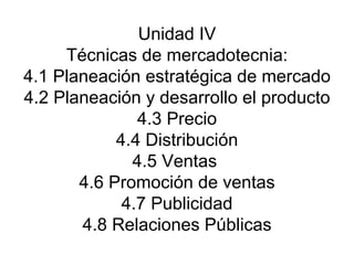 El documento explica diferentes técnicas de mercadotecnia como la planeación estratégica de mercado, el desarrollo de producto, precio, distribución, promoción y publicidad. Describe la clasificación de productos de consumo como bienes duraderos, destructivos, de conveniencia y especialidad. También cubre productos industriales como materia prima, equipo y partes. Explica conceptos como marca, logotipo, tipos de marcas y estrategias de marcas únicas, múltiples y de distribuidor.
