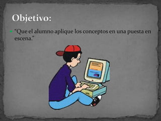 El documento describe los elementos clave de la puesta en escena teatral, incluyendo la escenografía, iluminación, vestuario, utilería y música. Explica que la puesta en escena implica un proceso de montaje que involucra al director, actores, diseñadores y otros para preparar la representación de la obra. Este proceso incluye etapas como la visualización, análisis del texto, caracterización de personajes, producción general y ensayos.