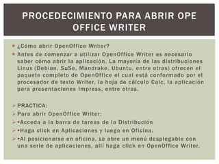 Este documento describe cómo abrir y utilizar el procesador de texto OpenOffice Writer en Linux. Explica que Writer puede usarse para crear documentos profesionales similares a Microsoft Word y describe las barras y herramientas principales de la interfaz como la barra de menú, barra de funciones, barra de formato y barra de estado. También proporciona instrucciones paso a paso para insertar y editar texto, seleccionar texto, guardar y cerrar documentos.