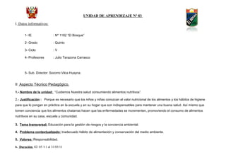 Este documento presenta la Unidad de Aprendizaje No 03 de quinto grado del colegio No 1182 “El Bosque”. Incluye información sobre el colegio, profesores y directivos. La unidad se enfoca en cuidar la salud consumiendo alimentos nutritivos y trata competencias de diferentes áreas como comunicación, matemática, ciencias naturales y educación física. Evaluará a los estudiantes a través de observación, dinámicas de grupo, fichas de trabajo y otros instrumentos.