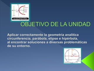 La circunferencia es el conjunto de puntos a igual distancia (radio) de un punto central. Un diámetro pasa por el centro y una cuerda es el segmento entre dos puntos de la circunferencia. Una parábola es la curva de puntos equidistantes de un foco y una directriz. Una elipse es la curva resultante de cortar un cono oblicuo y una hipérbola es una curva abierta de dos ramas obtenida cortando un cono recto de forma oblicua.