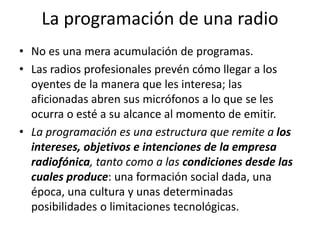 La programación radiofónica es un conjunto estructurado de contenidos que busca captar la atención de la audiencia mediante estrategias comunicativas y varía según factores como difusión, horarios y tipos de programación. Se considera un texto cultural que refleja visiones sociales y permite interacciones entre emisoras y oyentes, cuyo diseño implica la selección, dosificación y orden de los contenidos. Existen diversas modalidades de radio, organizadas según su discurso, audiencia y recursos técnicos, que garantizan la sostenibilidad económica y la gestión eficiente de la emisora.