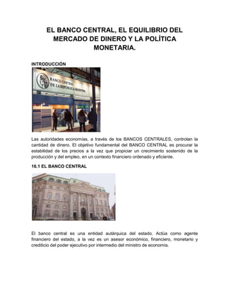 El documento describe las funciones y operaciones del banco central de un país. Explica que el banco central controla la oferta monetaria a través de la base monetaria, que consiste en el efectivo y reservas bancarias. El banco central puede expandir o contraer la base monetaria mediante operaciones de mercado abierto y préstamos a bancos, lo que afecta la tasa de interés y la oferta monetaria a través del multiplicador monetario. También supervisa el sistema bancario y establece la política monetaria para lograr objetivos como
