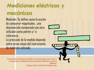 Este documento presenta información sobre mediciones eléctricas y mecánicas. Explica conceptos clave como sistema de unidades, instrumentos de medición, y cómo medir magnitudes eléctricas como tensión, intensidad y resistencia. También incluye ejemplos y ejercicios prácticos sobre cómo realizar mediciones usando instrumentos como el voltímetro, amperímetro y óhmetro.