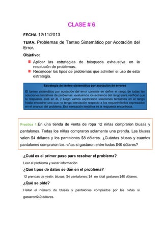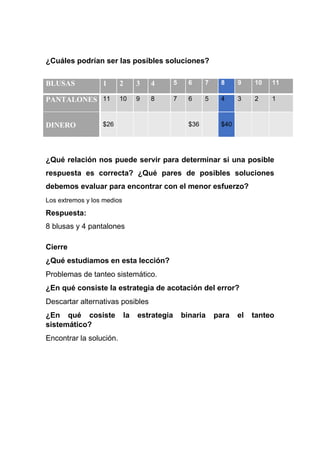 El documento describe la estrategia de tanteo sistemático por acotación de errores para resolver problemas. Esta estrategia implica definir el rango de todas las soluciones posibles, evaluar los extremos del rango para verificar que la respuesta está dentro, y luego explorar soluciones tentativas hasta encontrar una que cumpla con los requisitos. A continuación, presenta un ejemplo de problema y los pasos para resolverlo usando esta estrategia, incluyendo determinar las posibles soluciones y evaluar los extremos y medios para encontrar la respuesta correcta de manera eficiente.