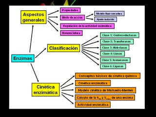 Las enzimas son proteínas que catalizan reacciones químicas de manera específica y eficiente. Pueden requerir cofactores como iones o grupos prostéticos para su actividad catalítica. Su estructura tridimensional determina su sitio activo y su especificidad por sustratos. La cinética enzimática estudia cómo la velocidad de reacción depende de factores como la concentración de sustrato, pH y temperatura.