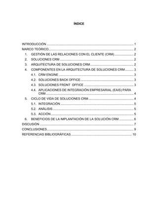 Este documento describe la arquitectura y el ciclo de vida de las soluciones CRM (gestión de relaciones con clientes). Explica que una solución CRM consta de un motor CRM, soluciones front office y back office, y aplicaciones de integración empresarial. Su ciclo de vida incluye las etapas de integración, análisis y acción. Implementar una solución CRM permite a las empresas mejorar la eficiencia de los procesos con clientes, aumentar el conocimiento sobre los clientes y detectar nuevas oportunidades