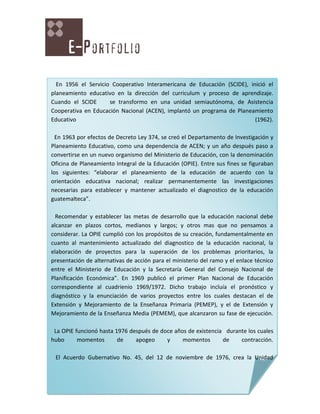 El documento describe la historia del planeamiento educativo en Guatemala. Señala que sus orígenes se remontan a las acciones pedagógicas para satisfacer las necesidades cambiantes de la educación. En 1956, una reunión de ministros de educación en Lima recomendó adoptar el planeamiento como una fórmula para abordar los problemas educativos. Posteriormente, en 1958 y 1962 se desarrollaron seminarios e iniciativas que promovieron el planeamiento educativo. En Guatemala, en 1963 se creó el Departamento de Investigación y Planeamiento Educat