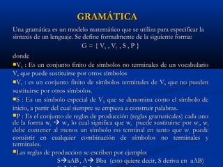 Este documento presenta una introducción a los conceptos básicos de las gramáticas formales y los lenguajes formales. Define formalmente una gramática y sus componentes. Explica los conceptos de reglas de producción, derivación, lenguaje generado y analisis gramatical. Incluye varios ejemplos para ilustrar estos conceptos.