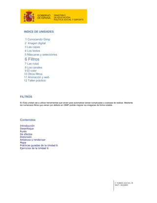 Este documento proporciona una introducción a los filtros en GIMP. Explica que los filtros pueden mejorar o modificar imágenes aplicando algoritmos matemáticos a los píxeles. Describe varios tipos de filtros como desenfoque, ruido y distorsión, e incluye instrucciones para aplicar filtros de desenfoque y ruido a imágenes de ejemplo.