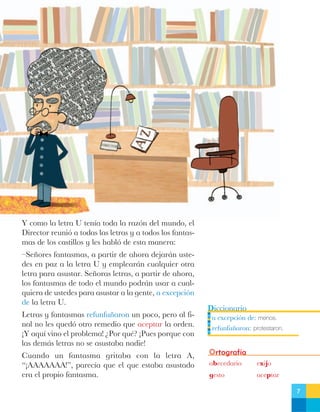 La letra U estaba cansada de solo usarse para asustar. Decidió que los fantasmas usarían otras letras para asustar. Pero con las demás letras no asustaban a nadie. Al final, se acordó que la U seguiría siendo la letra para asustar pero sería la primera de las cinco vocales.
