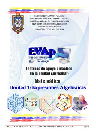 Este documento presenta la unidad 1 sobre expresiones algebraicas. Introduce conceptos como términos semejantes, tipos de expresiones algebraicas como enteras, polinómicas, racionales y radicales. Explica operaciones con expresiones algebraicas como adición, sustracción, multiplicación y división de polinomios. También cubre productos notables y factorización.