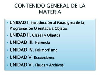 El documento presenta las unidades de una introducción a la programación orientada a objetos, incluyendo clases, objetos, herencia, polimorfismo y excepciones. Explica conceptos como abstracción, encapsulamiento, modularidad y diagrama de clases. El objetivo es diseñar e implementar objetos de programación que permitan resolver situaciones reales de ingeniería.