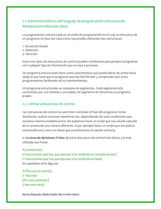 El documento describe los elementos básicos de un lenguaje de programación estructurado, incluyendo lenguaje de programación, programa, instrucción, tipos de datos y directivas. Explica que la programación estructurada utiliza tres estructuras de control principales (secuencia simple, selección e iteración) y que un programa estructurado se compone de segmentos con entrada y salida. También cubre el uso de estructuras de control como if-else para tomar decisiones.