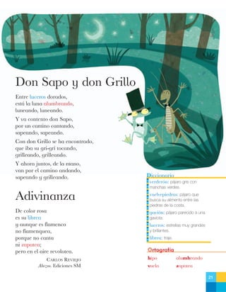 Este documento presenta varias poesías y adivinanzas infantiles. La primera poesía trata sobre un hipopótamo que tenía hipo y cómo se le quitó al asustarse por un rugido. Otra poesía compara las similitudes y diferencias entre varias aves que empiezan por V. Otra más narra un encuentro entre un sapo y un grillo. La última es una adivinanza sobre un animal rosa que revolotea.