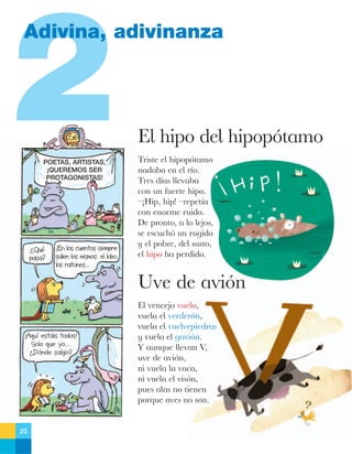 Este documento presenta varias poesías y adivinanzas infantiles. La primera poesía trata sobre un hipopótamo que tenía hipo y cómo se le quitó al asustarse por un rugido. Otra poesía compara las similitudes y diferencias entre varias aves que empiezan por V. Otra más describe el encuentro nocturno de un sapo y un grillo. La última es una adivinanza sobre un animal rosa que revolotea pero no canta ni baila.