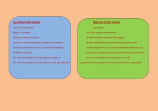 Este documento contrasta los métodos tradicionales de enseñanza con métodos más creativos y centrados en el alumno, sugiriendo que los enfoques tradicionales se ciñen estrictamente a la programación y evalúan a los alumnos mediante pruebas preestablecidas, mientras que los enfoques más nuevos fomentan la creatividad, el descubrimiento de conocimientos, el uso de herramientas tecnológicas y evalúan a los alumnos con rúbricas elaboradas de forma colaborativa.