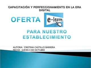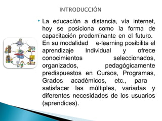 La educación a distancia a través de internet se posiciona como la forma predominante de capacitación y perfeccionamiento en el futuro. Ofrece flexibilidad en horarios y lugares de estudio, pero requiere habilidades para el aprendizaje autónomo. Se presentan seis cursos de capacitación en educación a distancia para profesores, asistentes de la educación y docentes técnico-profesionales en diversas áreas.