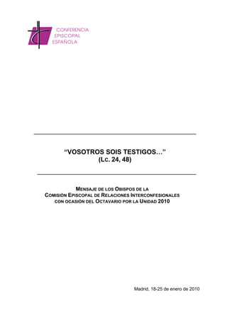 Este documento presenta el lema del Octavario de Oración por la Unidad de los Cristianos de 2010: "Vosotros sois testigos de todas estas cosas" (Lc 24:48). Resalta la importancia de dar testimonio de Cristo y la necesidad de superar las divisiones entre las Iglesias. También reflexiona sobre los avances del ecumenismo en los últimos 100 años desde la Conferencia Misionera Mundial de Edimburgo de 1910, y pide respeto por la libertad religiosa y los derechos de las diferentes comunidades eclesiales.