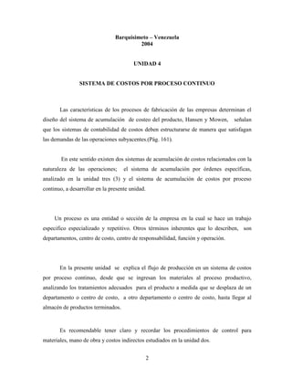 Este documento describe un sistema de costos por proceso continuo. Explica que este sistema se usa cuando la producción pasa por varias operaciones en departamentos sucesivos hasta completarse. Describe el flujo de materiales y costos a través de los departamentos, y cómo se calculan y asignan los costos a cada unidad producida y departamento. El objetivo principal es determinar los costos unitarios para cada departamento.
