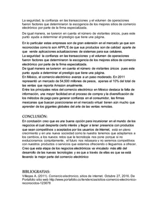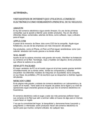 El documento describe diferentes sitios de comercio electrónico exitosos como Amazon, Apple, Walmart y HP. Explica que el comercio electrónico se ha vuelto cada vez más popular debido a la comodidad que ofrece a los compradores. También resume brevemente la evolución histórica del comercio electrónico desde las ventas por catálogo en el siglo XIX hasta el auge del comercio en línea en la actualidad.