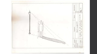 Este documento proporciona instrucciones para dibujar la sombra de una persona bajo dos configuraciones de iluminación diferentes. La primera sección describe cómo dibujar la sombra de una persona con luz artificial, trazando líneas desde la fuente de luz hasta los puntos del cuerpo y proyectándolas en el plano horizontal. La segunda sección explica cómo dibujar la sombra de una persona con luz solar, trazando rayos paralelos desde puntos extremos del cuerpo hasta un punto de fuga coincidente con la proyección horizontal del sol y