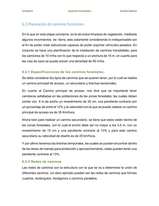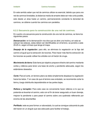 El documento detalla la planificación y construcción de caminos forestales, enfatizando la limpieza de vegetación y los movimientos de tierra necesarios para soportar vehículos pesados. Se describen especificaciones para caminos principales y secundarios, así como la importancia de redes de caminos eficientes para facilitar el transporte. Finalmente, se presentan los pasos secuenciales para la construcción, desde la demarcación hasta la compactación del lecho del camino.