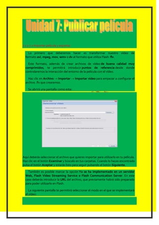 Este documento proporciona instrucciones para importar y exportar películas en Flash, optimizar el tamaño de las películas, e implementar un proyecto autoajustable. Explica cómo convertir videos a formato FLV, importar clips de otras películas, y consideraciones para dibujos, organización, textos y animación para reducir el tamaño de la descarga. También recomienda compilar los archivos Flash a SWF, conservar la jerarquía de carpetas, compilar la película principal como EXE e incluir un archivo