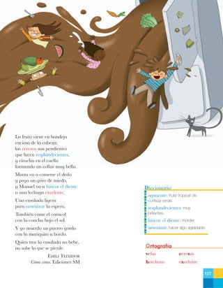 Este documento presenta una recopilación de poemas y rimas infantiles. Los poemas tratan temas como un banquete imaginario con diferentes platos y frutas de forma rima, así como animales que desean cosas y una cebra que desaparece. El documento también incluye actividades como completar trabajos con rimas, formar parejas de palabras y escribir poemas propios.