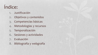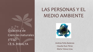Este documento presenta una unidad didáctica sobre las personas y el medio ambiente dirigida a estudiantes de 3o de ESO. La unidad contiene objetivos, contenidos, competencias, metodología, temporalización y evaluación. Los contenidos se centran en los recursos naturales, residuos y el impacto humano en el medio ambiente. Se utilizan métodos activos como debates, roles y talleres de reciclaje. La unidad busca promover la alfabetización científica y la concienciación medioambiental en los estudiantes