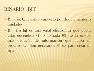El documento define términos básicos de informática como bit, byte y prefijos binarios. Explica que un bit es la unidad más pequeña de información y que 8 bits forman un byte. Los prefijos binarios como Kilo, Mega y Giga se usan para contar bytes y son potencias de 2, a diferencia de los prefijos SI que son potencias de 10. También describe medios comunes de almacenamiento como discos duros, USBs, CDs y DVDs, indicando sus capacidades típicas.