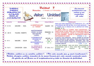 El documento presenta una serie de unidades de estudio bíblico sobre la obediencia y la unidad. Cada unidad incluye información sobre su duración, responsable, tema, pasajes bíblicos relevantes y versículos para memorizar. Los temas tratados incluyen la importancia de la obediencia según las historias bíblicas de Jonás, Samuel y Pablo, y la importancia de mantener la unidad en la fe y el conocimiento de Dios según Efesios.