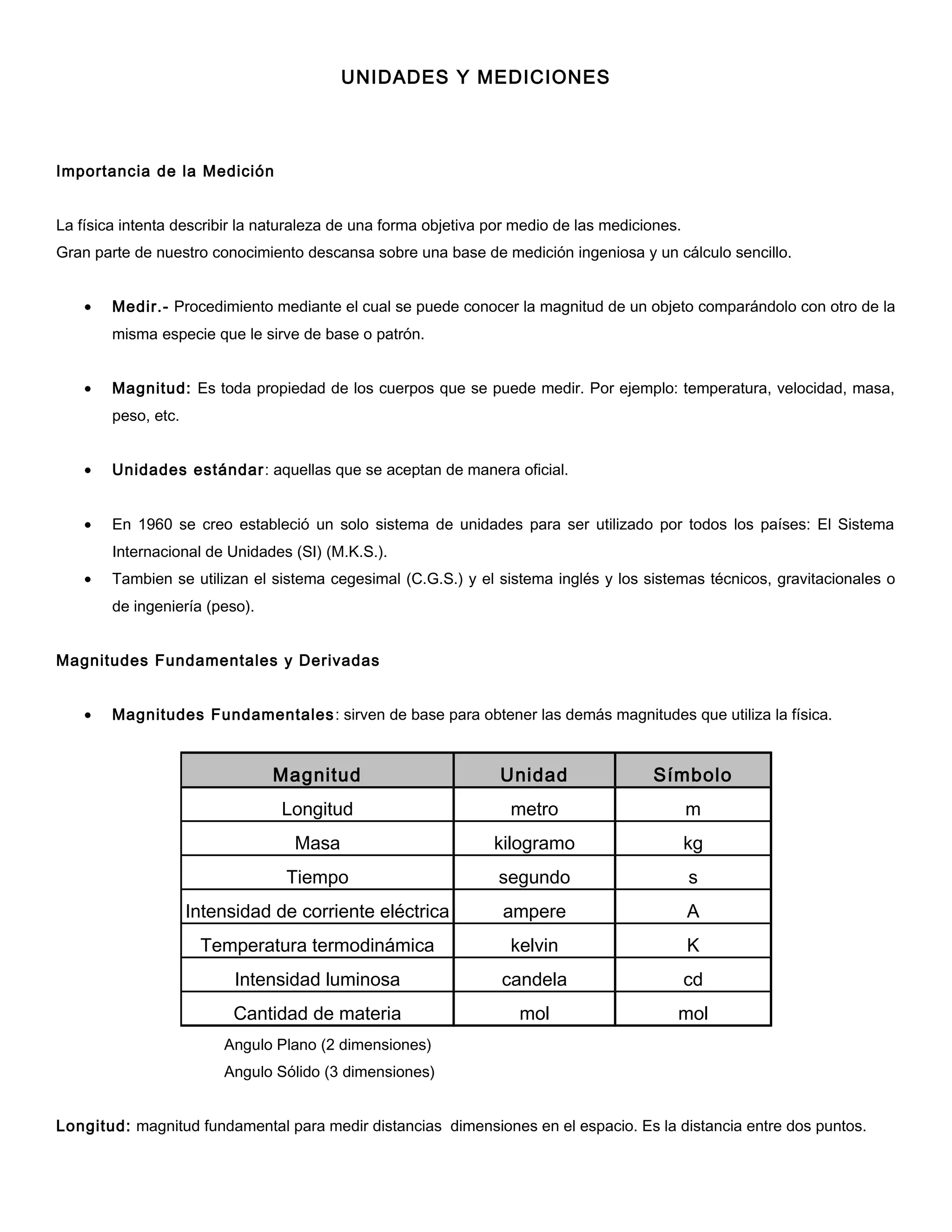 Este documento describe la importancia de la medición en la física y los sistemas de unidades. Explica las magnitudes fundamentales como la longitud, masa y tiempo, y las magnitudes derivadas como el área, volumen y velocidad. También compara los sistemas de unidades internacionales, CGS e inglés, y cubre los múltiplos y submúltiplos usados para expresar cantidades muy grandes o pequeñas.