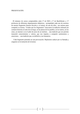 El documento presenta el plan de lectura de fragmentos literarios de un instituto. Contiene la introducción, el índice de lectores que incluye alumnos y profesores, y el índice de los 37 fragmentos literarios que serán leídos. El objetivo es compartir lecturas al calor de un fuego como una tradición milenaria que transmite conocimientos y valores.