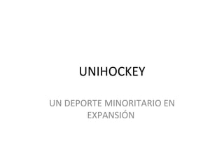El unihockey es un deporte de origen estadounidense que se desarrolló a partir del hockey sobre hielo para ser practicado sin hielo. Se difundió primero en Suecia y otros países europeos en los años 1960-1980, formándose la Federación Internacional en 1986. En España se empezó a practicar en los colegios en los años 1990 y se formó la asociación española en 1998 para promoverlo y organizarlo.
