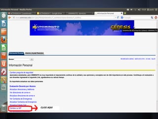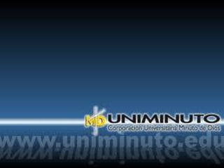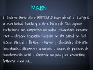 El documento presenta la misión, visión, reglamentos estudiantiles y políticas de asistencia y calificaciones del Sistema Universitario UNIMINUTO. Su misión es ofrecer educación superior de calidad con acceso flexible para formar profesionales competentes y líderes de transformación social. Su visión para 2012 es ser reconocido por su aporte educativo al desarrollo del país y la calidad de sus programas con amplia cobertura a través de múltiples sedes.