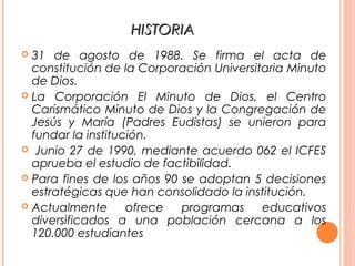 El documento resume la historia de la Universidad Minuto de Dios, fundada en 1988 por la Corporación El Minuto de Dios, el Centro Carismático Minuto de Dios y la Congregación de Jesús y María. Actualmente ofrece programas educativos diversificados a aproximadamente 120,000 estudiantes. También describe brevemente el programa de Administración en Salud Ocupacional de la universidad, el cual forma estudiantes para contribuir a la investigación, planeación, organización y educación relacionadas con la salud y seguridad laboral de los trabajadores.