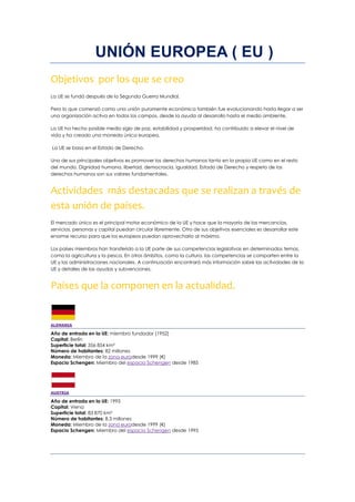 La Unión Europea se creó después de la Segunda Guerra Mundial para promover la paz, la estabilidad y la prosperidad económica. Actualmente está formada por 27 países y funciona a través de instituciones como el Consejo Europeo, el Parlamento Europeo y la Comisión Europea. Sus principales actividades incluyen el mercado único para facilitar el comercio entre los estados miembros y la promoción de los derechos humanos tanto dentro como fuera de la UE.