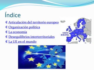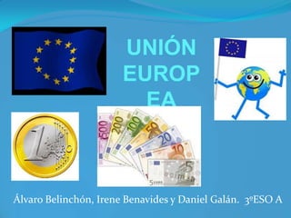 El documento resume la historia y desarrollo de la Unión Europea. Explica cómo diferentes imperios a lo largo de la historia han unido grandes partes de Europa y cómo después de la Segunda Guerra Mundial algunos países comenzaron a cooperar y formar organizaciones como la CECA y CEE que eventualmente evolucionaron en la Unión Europea de hoy. Describe las principales instituciones de la UE como el Consejo, Comisión y Parlamento Europeo, y cómo la UE ha creado un mercado único y moneda común. También analiza los desafíos