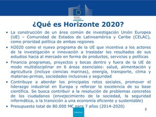 Este documento describe dos programas de cooperación científica y académica entre Europa y otros países: Horizonte 2020 y Erasmus+. Horizonte 2020 financia proyectos de investigación e innovación en áreas como salud, energía y cambio climático, con un presupuesto de 80.000 millones de euros hasta 2020. Erasmus+ apoya la movilidad de estudiantes y académicos entre instituciones de educación superior a través de becas y proyectos conjuntos.