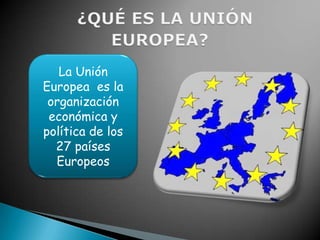 La Unión Europea es una organización de 27 países europeos creada después de la Segunda Guerra Mundial para promover la paz, la cooperación económica y la libertad de movimiento entre sus miembros. Algunas de sus características clave incluyen el uso del euro como moneda común y la capacidad de viajar y trabajar libremente entre los países de la UE.